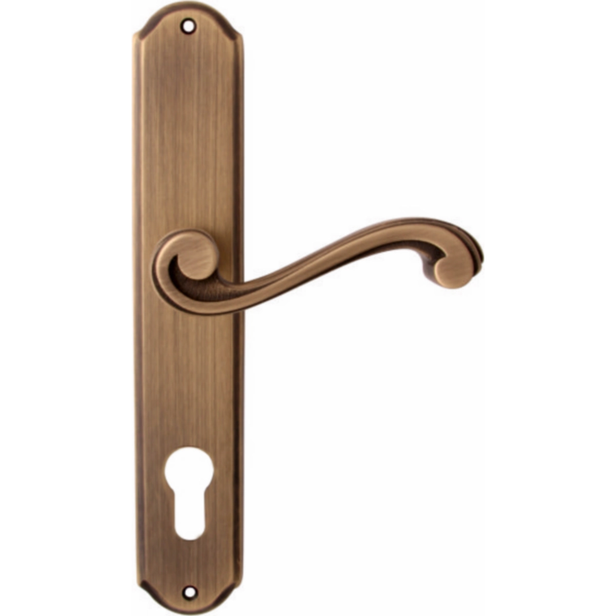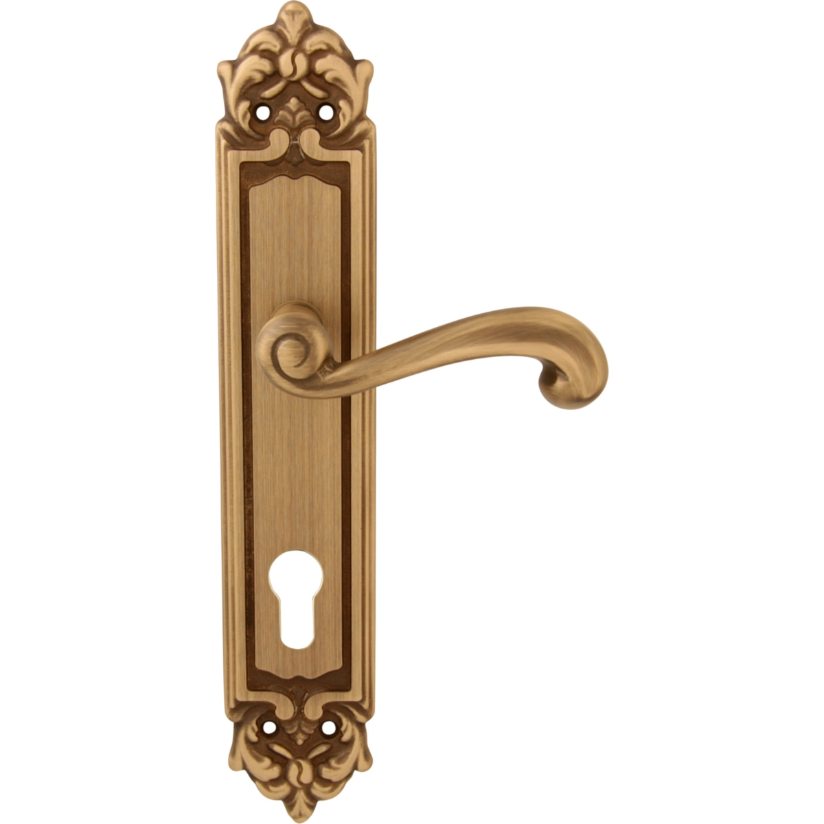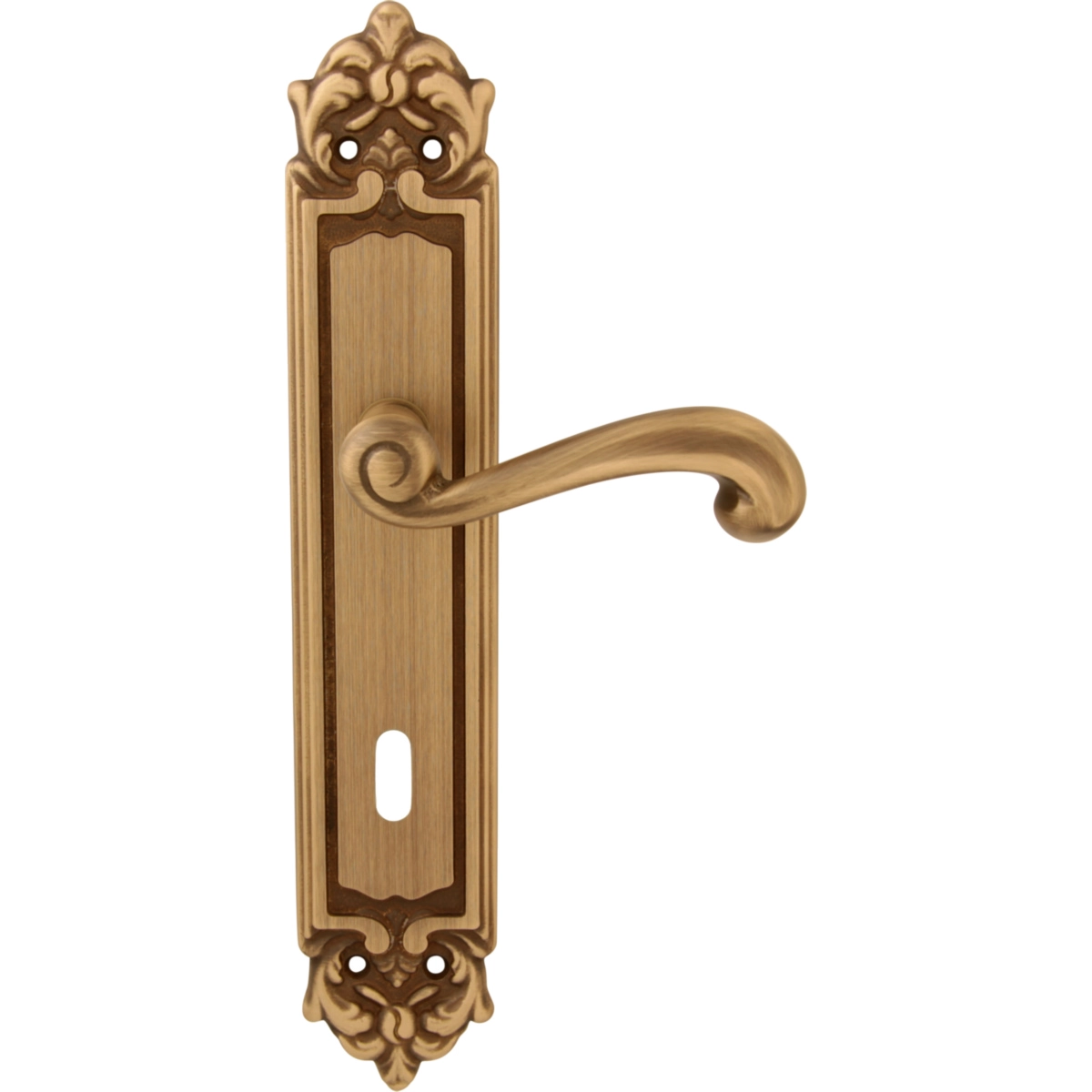 Дверная ручка на планке из коллекции Melodia фабрики Fadex (Италия) с отверстием под цилиндровый механизм. Дверные ручки выполнены в классическом стиле и изготовлены из высококачественной латуни методом художественного литья. Каждая модель, в зависимости от типа запирания замка, может иметь 4 варианта исполнения планки: без запирания (глухая), с сантехническим фиксатором, с отверстием под цилиндровый механизм, а также с отверстием под межкомнатный (кабинетный) ключ «буратино». Таким образом, ручки одной модели можно подобрать как для межкомнатных, так и для входных дверей.