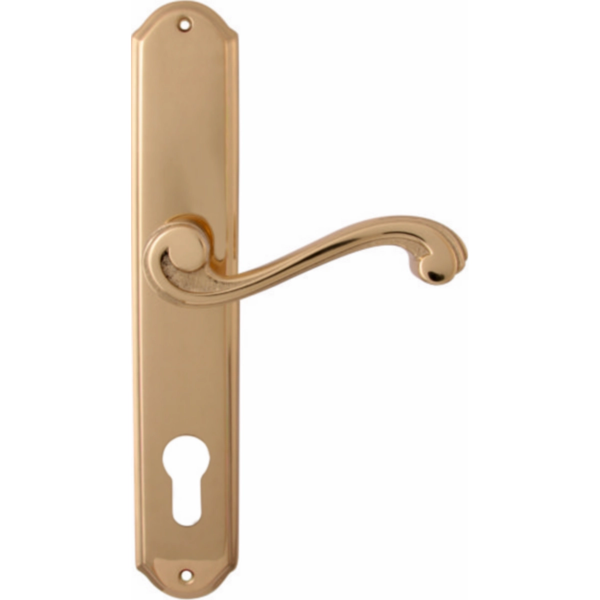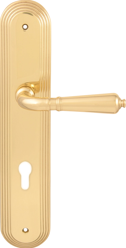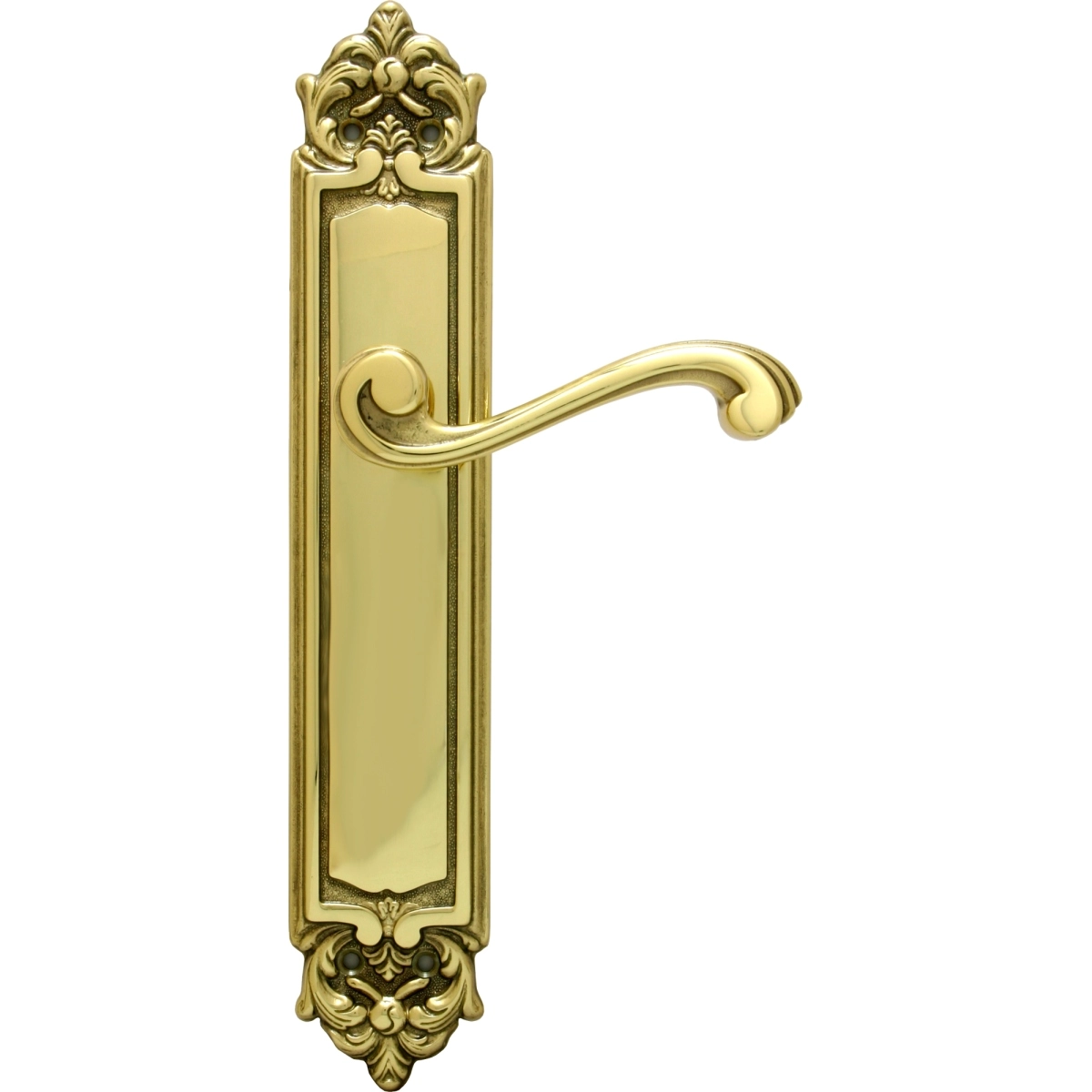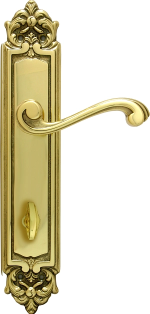 Дверная ручка на планке из коллекции Melodia фабрики Fadex (Италия) с отверстием под межкомнатный ключ. Дверные ручки выполнены в классическом стиле и изготовлены из высококачественной латуни методом художественного литья. Каждая модель, в зависимости от типа запирания замка, может иметь 4 варианта исполнения планки: без запирания (глухая), с сантехническим фиксатором, с отверстием под цилиндровый механизм, а также с отверстием под межкомнатный (кабинетный) ключ «буратино». Таким образом, ручки одной модели можно подобрать как для межкомнатных, так и для входных дверей.