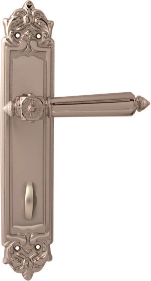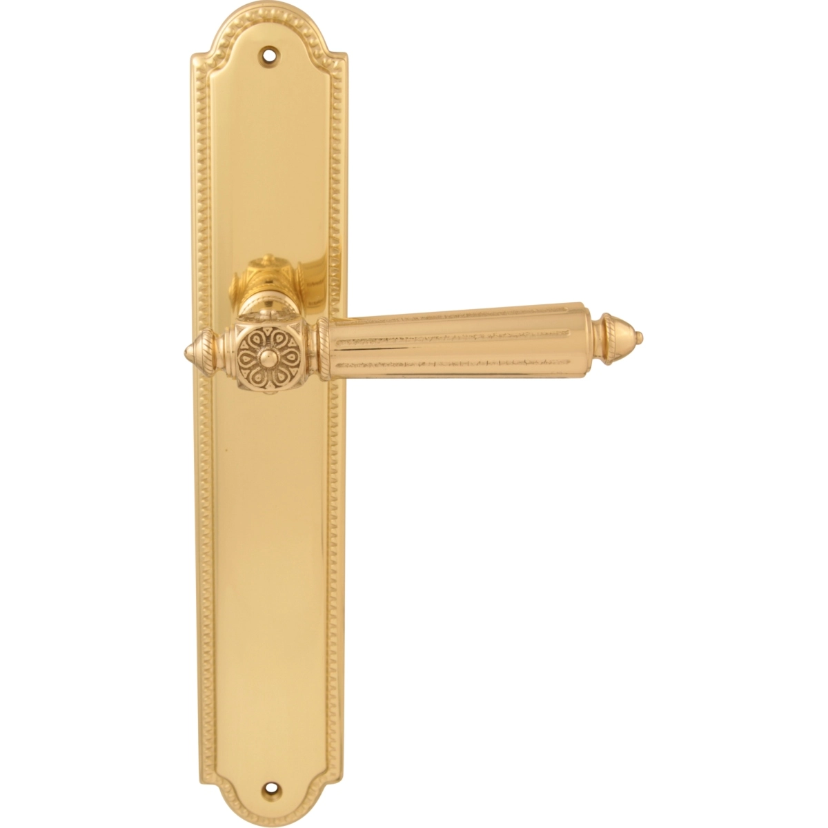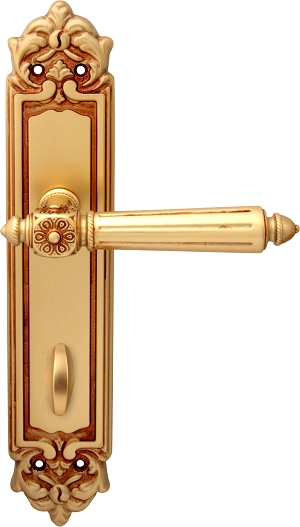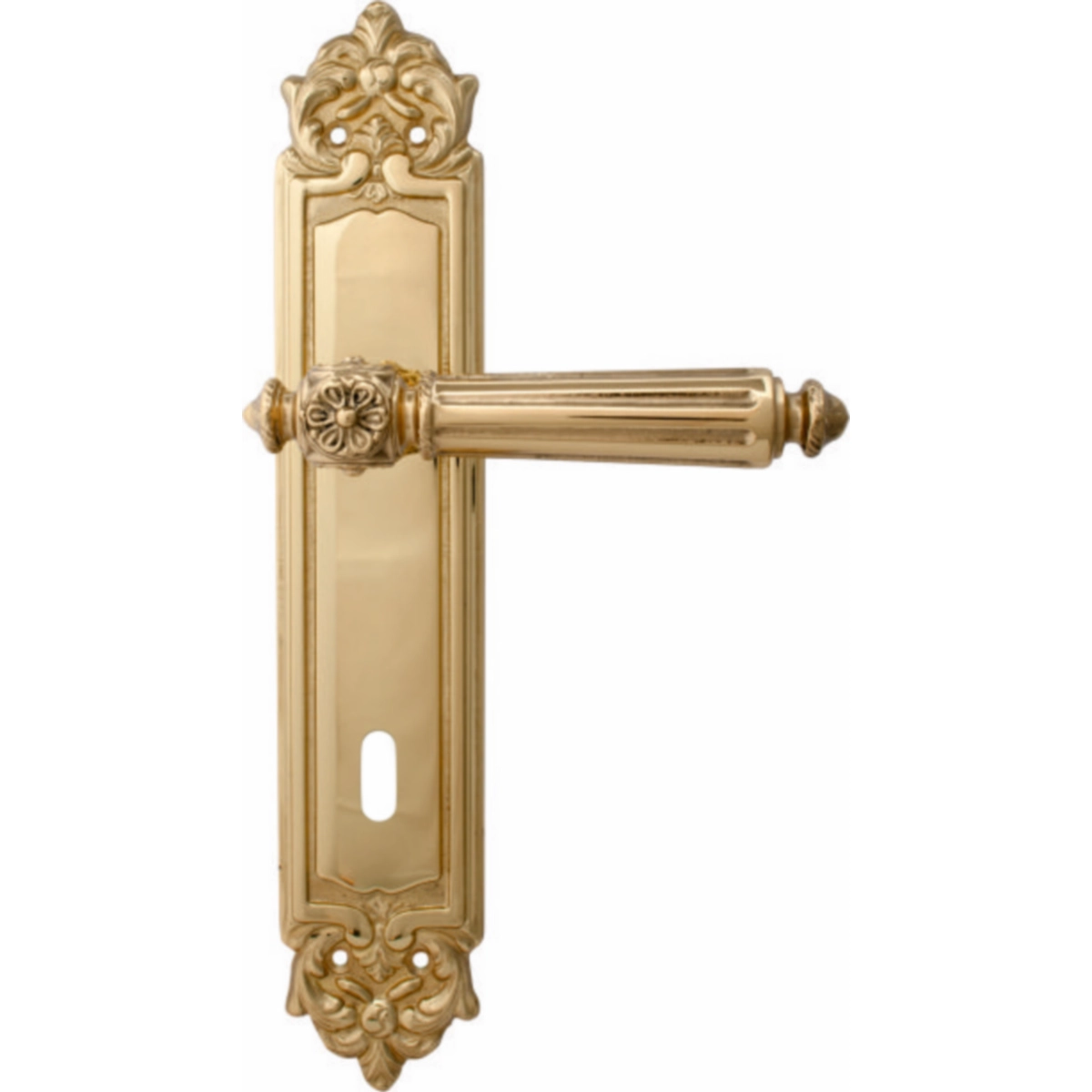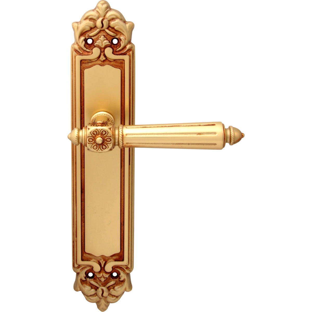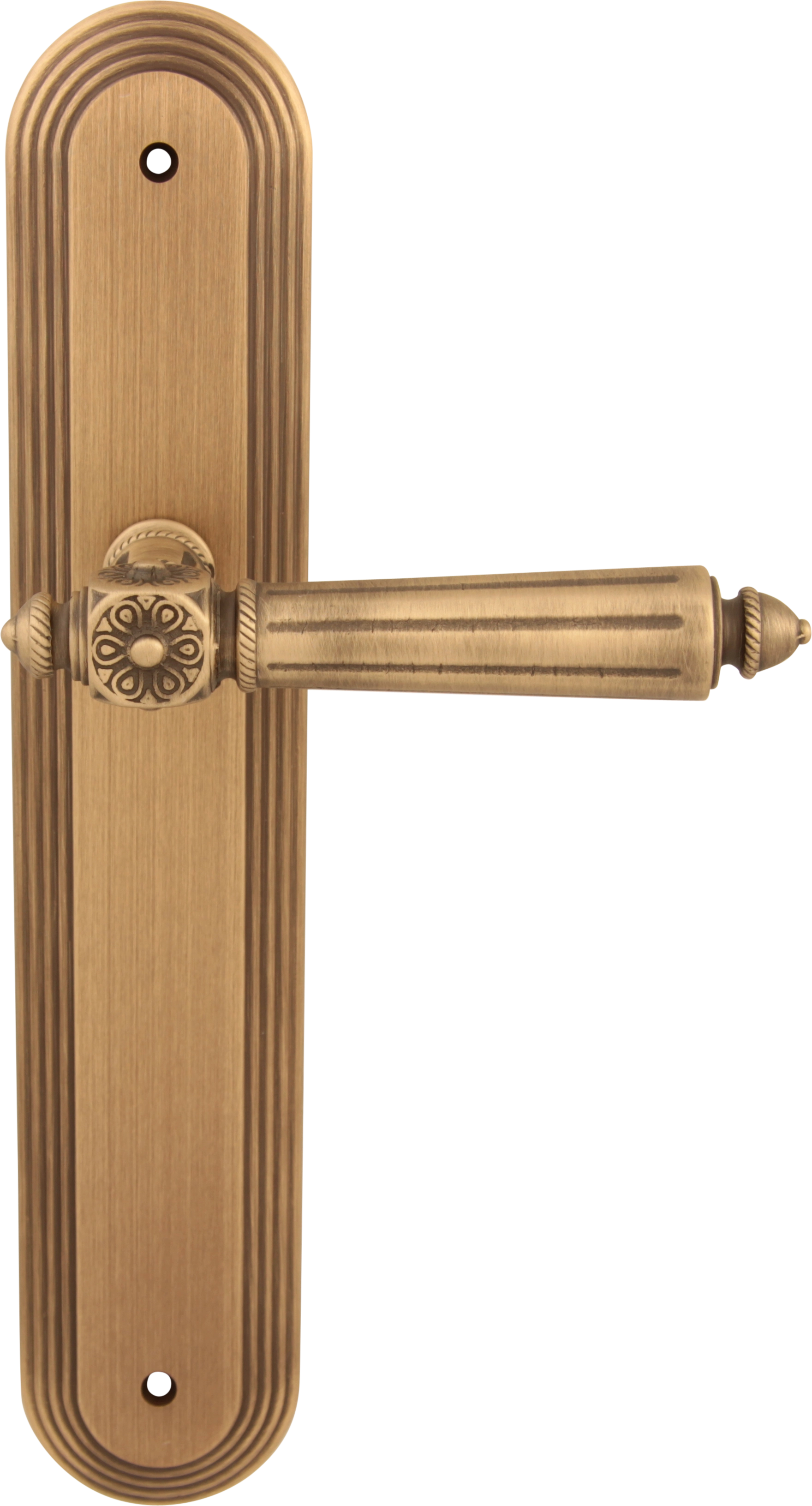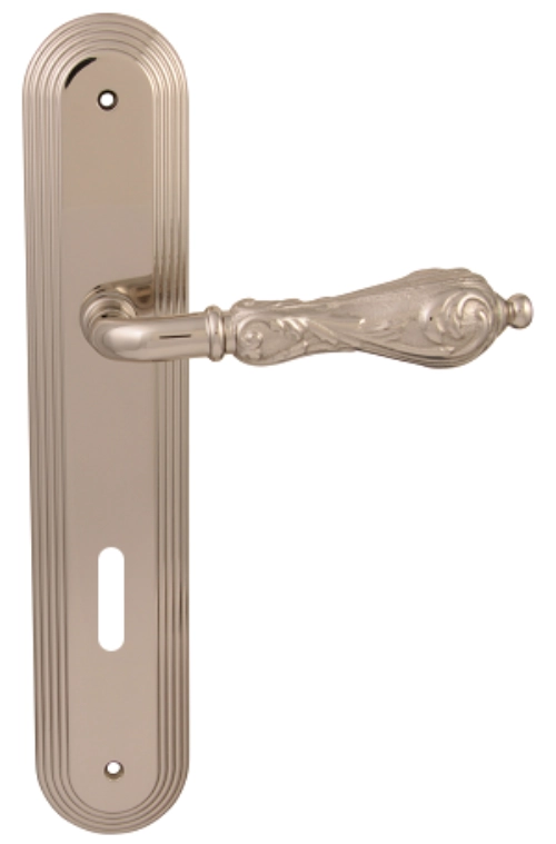 Дверная ручка на планке из коллекции Melodia фабрики Fadex (Италия) с отверстием под межкомнатный ключ. Дверные ручки выполнены в классическом стиле и изготовлены из высококачественной латуни методом художественного литья. Каждая модель, в зависимости от типа запирания замка, может иметь 4 варианта исполнения планки: без запирания (глухая), с сантехническим фиксатором, с отверстием под цилиндровый механизм, а также с отверстием под межкомнатный (кабинетный) ключ «буратино». Таким образом, ручки одной модели можно подобрать как для межкомнатных, так и для входных дверей.