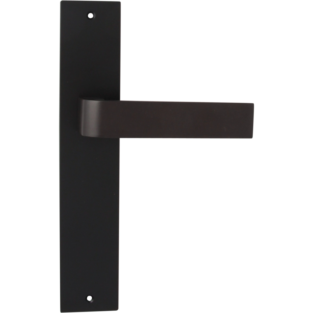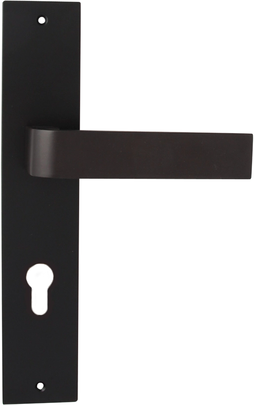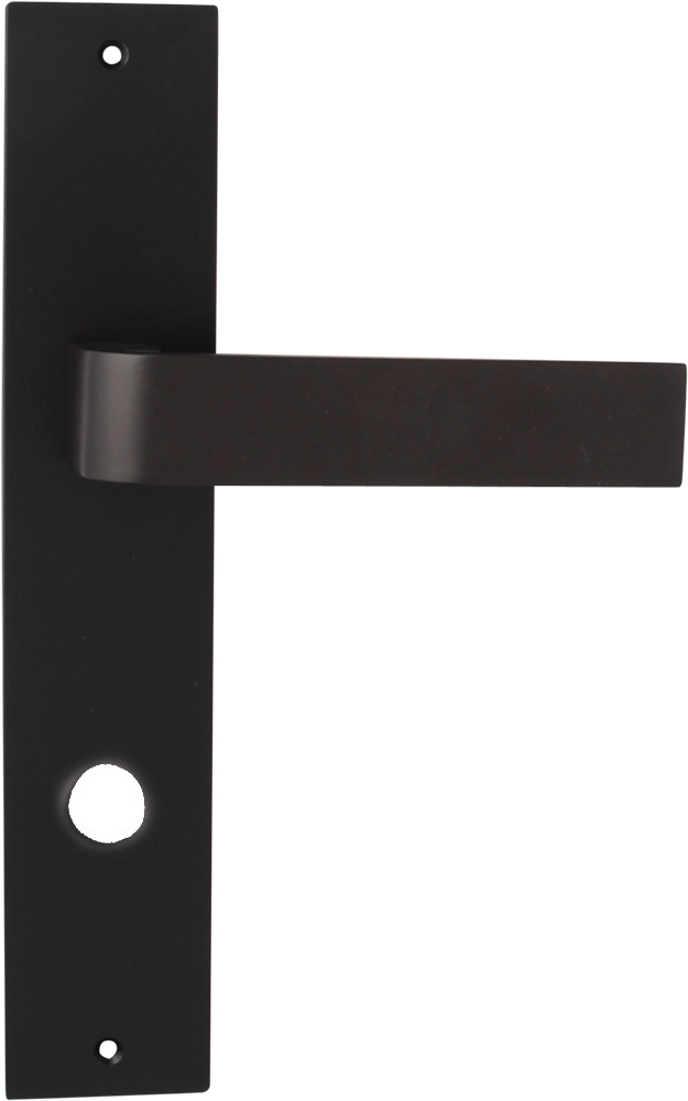 Черная дверная ручка на планке из коллекции Forme фабрики Fadex (Италия) с отверстием под цилиндровый механизм. Дверные ручки выполнены в современном стиле и идеально подойдут для общественных и офисных помещений. Каждая модель, в зависимости от типа запирания замка, может иметь три варианта исполнения планки: без запирания (глухая), с сантехническим фиксатором, а также с отверстием под цилиндровый механизм. Таким образом, ручки одной модели можно подобрать как для межкомнатных, так и для входных дверей.