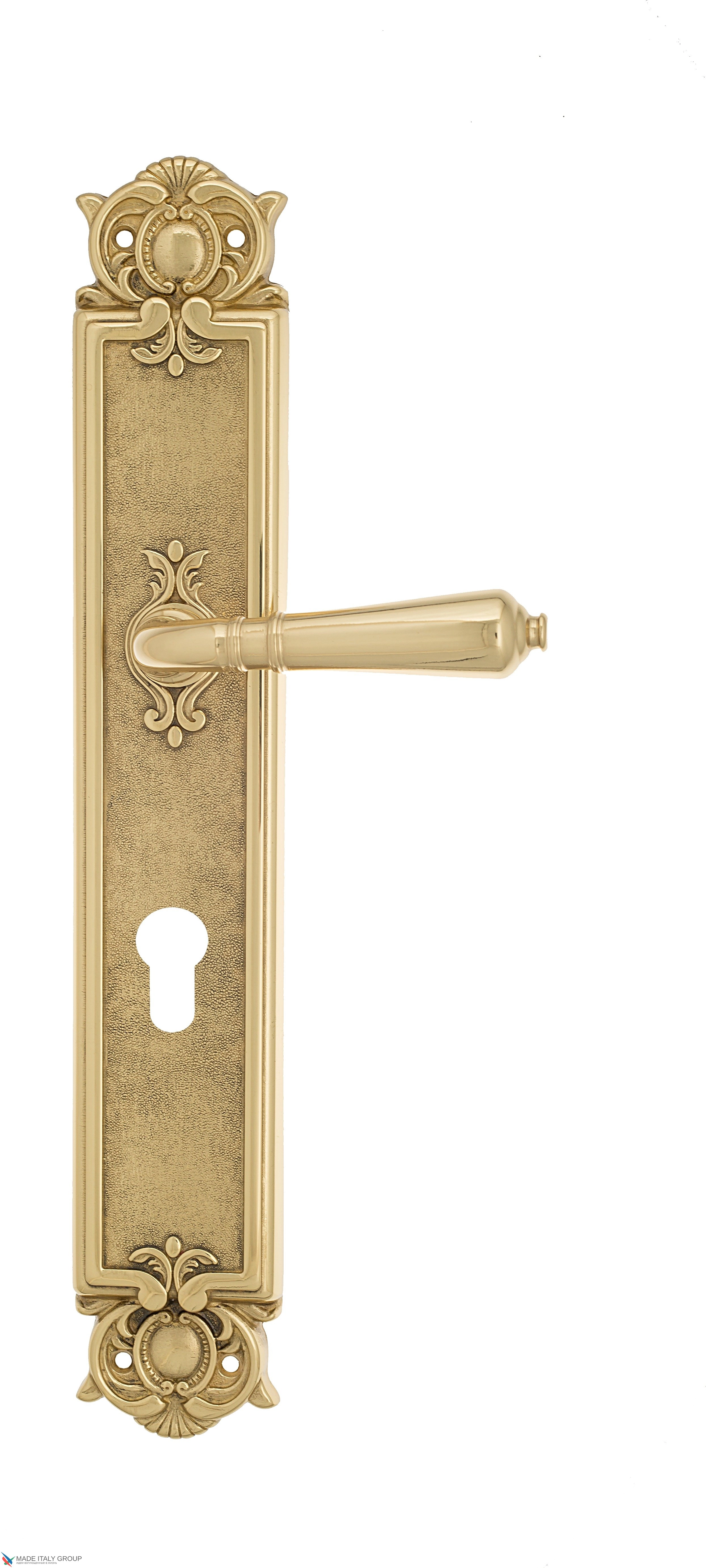 Дверная ручка на планке «Vignole» фабрики Venezia (Италия) с отверстием под цилиндровый механизм. Дверные ручки выполнены в классическом стиле и изготовлены из высококачественной латуни методом художественного литья.