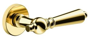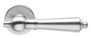 Ручка дверная на круглой розетке из оригинальной авторской коллекции известного производителя дверной фурнитуры – итальянской фабрики DND handles. Каждая модель, в зависимости от типа запирания замка, может комплектоваться дополнительными накладками (розетками) на дверь: с сантехническим фиксатором, с отверстием под межкомнатный (кабинетный) ключ, а также с отверстием под цилиндровый механизм. Накладки полностью совпадают по форме и цвету с розетками на ручке. Таким образом, ручки одной модели можно подобрать как для межкомнатных, так и для входных дверей.