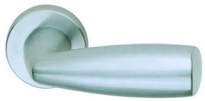 Ручка дверная на круглой розетке из оригинальной авторской коллекции известного производителя дверной фурнитуры – итальянской фабрики DND handles. Каждая модель, в зависимости от типа запирания замка, может комплектоваться дополнительными накладками (розетками) на дверь: с сантехническим фиксатором, с отверстием под межкомнатный (кабинетный) ключ, а также с отверстием под цилиндровый механизм. Накладки полностью совпадают по форме и цвету с розетками на ручке. Таким образом, ручки одной модели можно подобрать как для межкомнатных, так и для входных дверей.