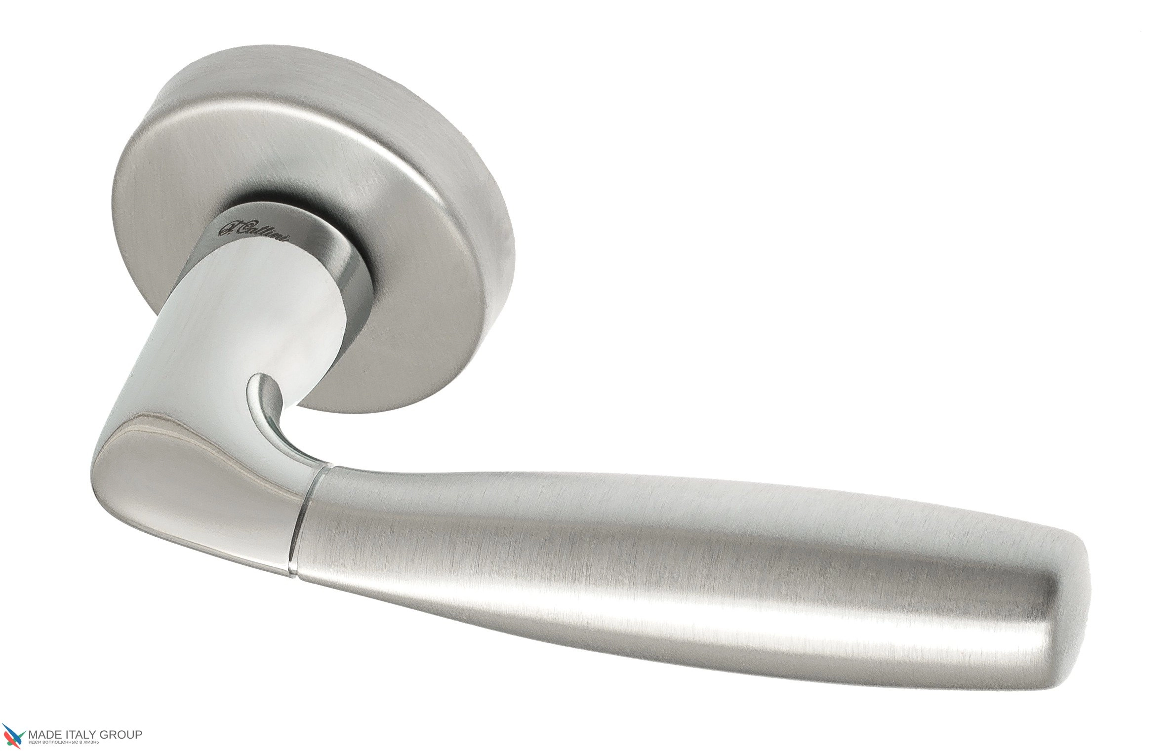 Дверная ручка «Jet» фабрики Fratelli Cattini (Италия) на круглой розетке в современном стиле.
