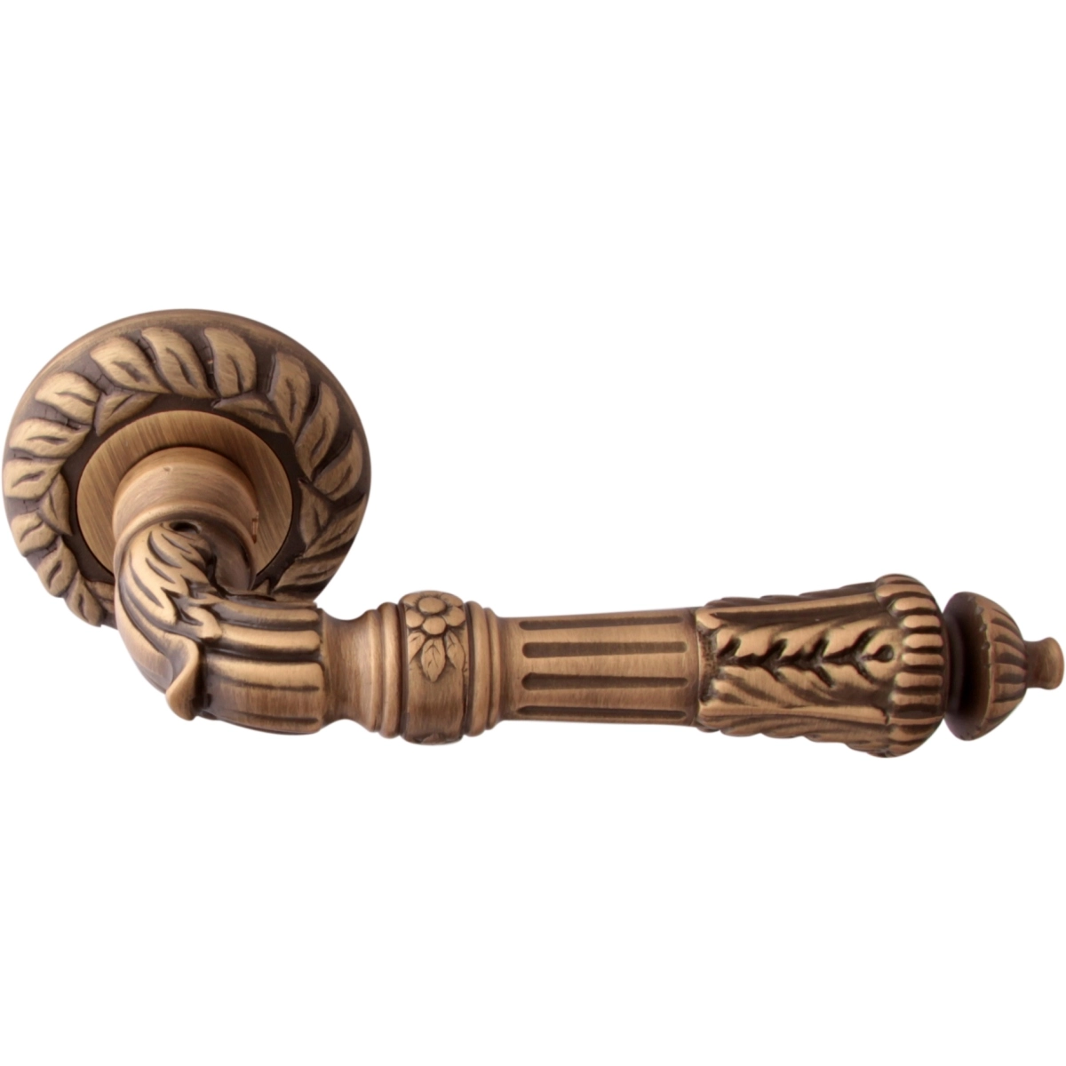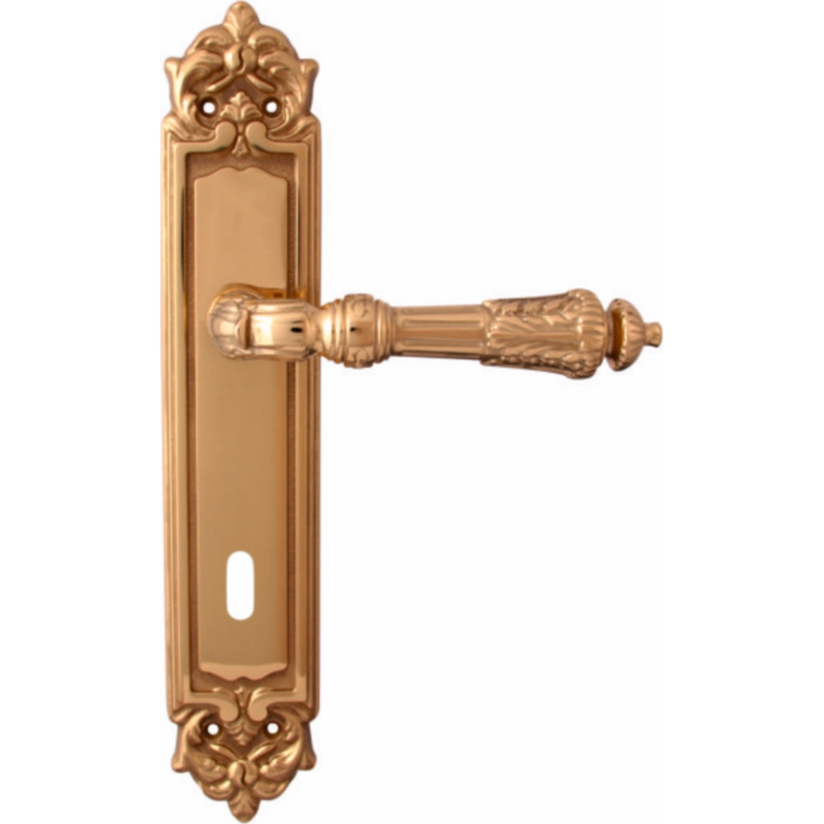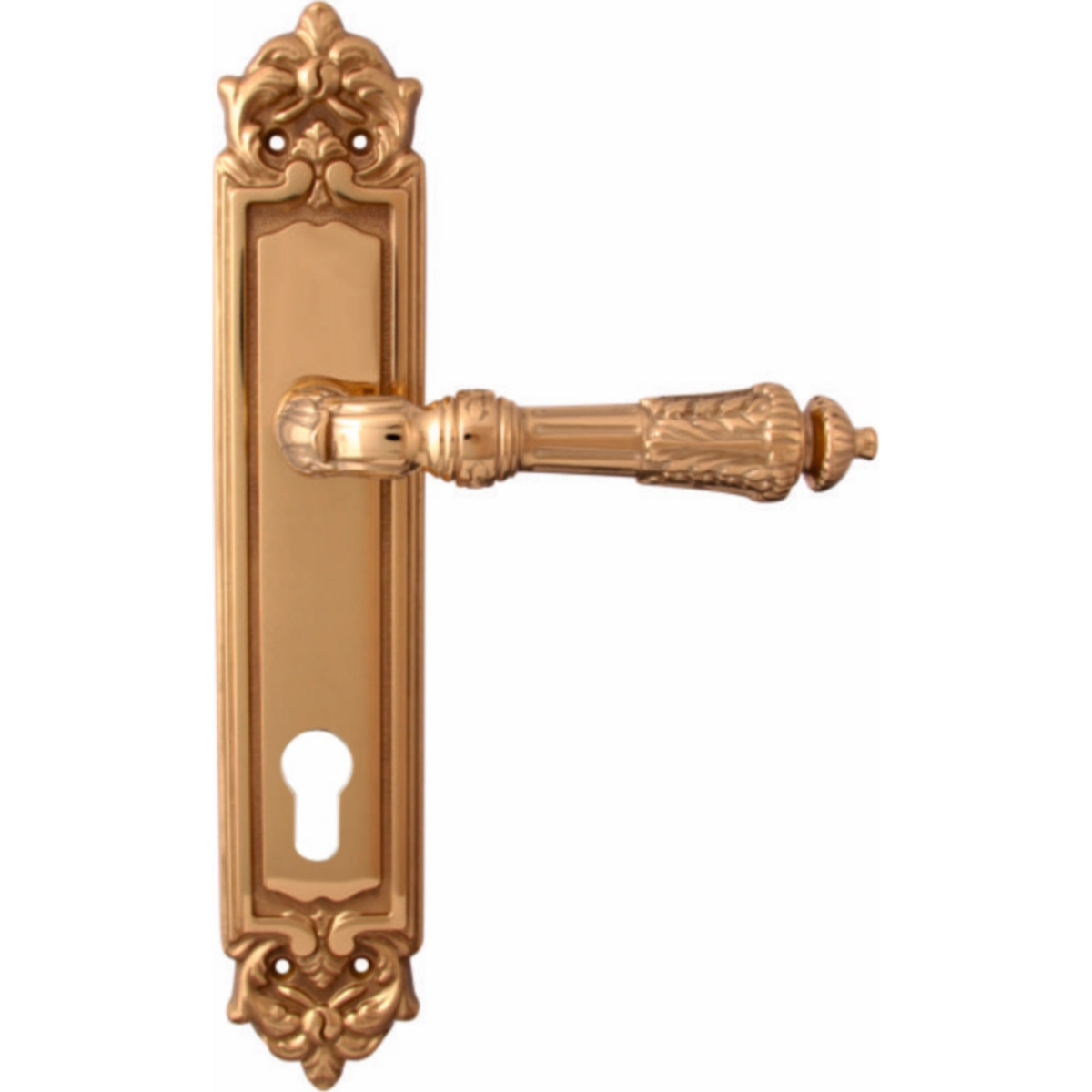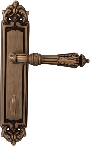 Дверная ручка из коллекции Melodia фабрики Fadex (Италия) на круглой розетке. Дверные ручки выполнены в классическом стиле и изготовлены из высококачественной латуни методом художественного литья. Каждая модель, в зависимости от типа запирания замка, может комплектоваться дополнительными накладками (розетками) на дверь: с сантехническим фиксатором, с отверстием под межкомнатный (кабинетный) ключ, а также с отверстием под цилиндровый механизм. Накладки полностью совпадают по форме и цвету с розетками на ручке. Таким образом, ручки одной модели можно подобрать как для межкомнатных, так и для входных дверей.